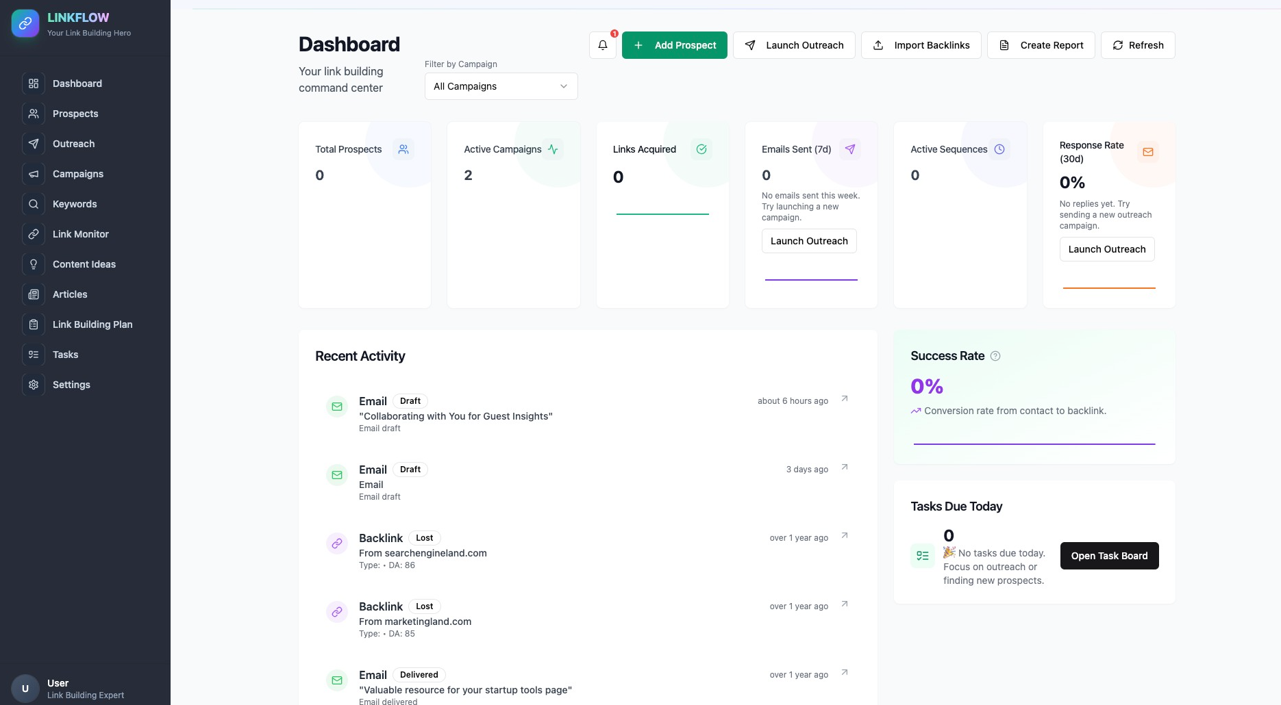 LinkFlow brings every part of link building into one workspace. From prospecting and outreach to tracking backlinks and planning campaigns, everything you need is streamlined, automated, and powered by AI. Build smarter, faster, and at scale, all in one place.